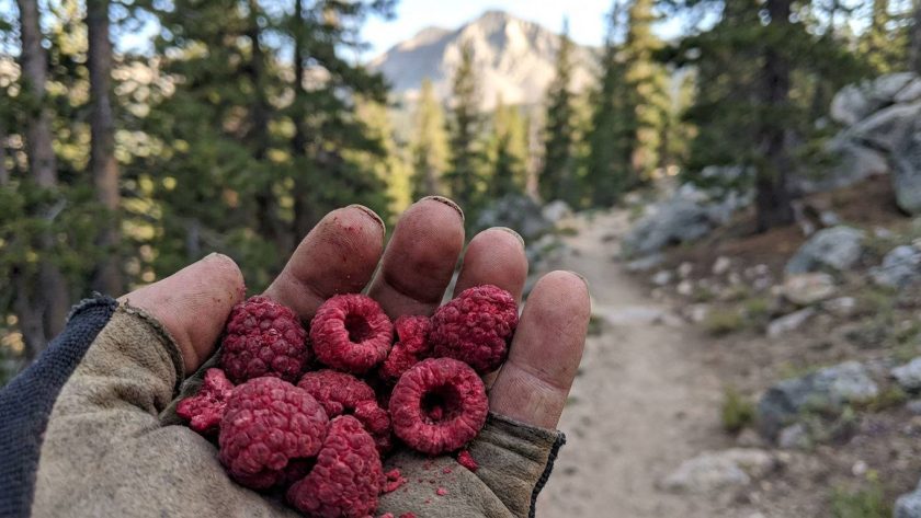 Dlon turysty z garscia liofilizowanych malin w gorach.