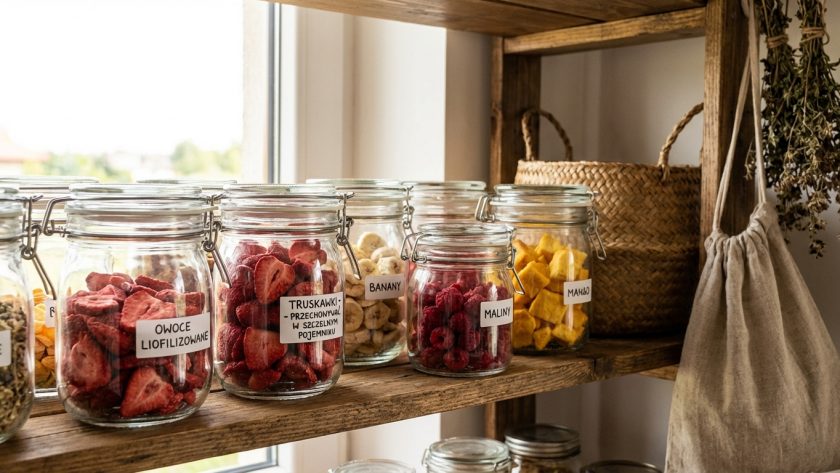 - Dodaj absorber wilgoci – małe saszetki z żelem krzemionkowym (silica gel), które znajdziesz w wielu opakowaniach produktów. Jedna saszetka w słoiku z liofilizowanymi owocami znacząco przedłuży ich chrupkość.