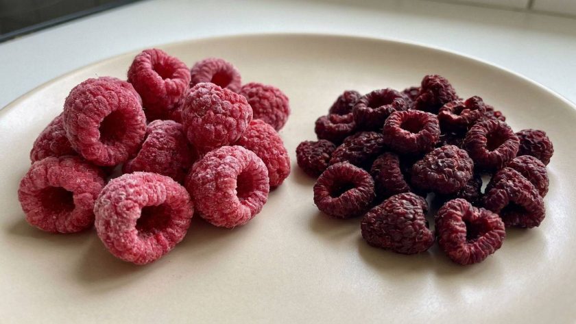 Liofilizowane maliny rehydrują się błyskawicznie po zalaniu gorącą wodą; uwalniają cały swój smak w zaledwie kilka chwil. Twarde owoce suszone tradycyjnie zazwyczaj pozostają gumowate i trudne do pogryzienia, nawet po długim moczeniu w plenerowej owsiance.